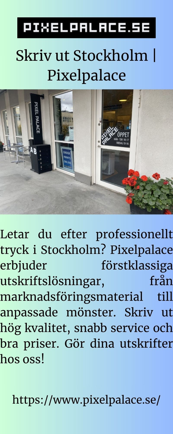 Letar du efter professionellt tryck i Stockholm? Pixelpalace erbjuder förstklassiga utskriftslösningar, från marknadsföringsmaterial till anpassade mönster. Skriv ut hög kvalitet, snabb service och bra priser. Gör dina utskrifter hos oss!